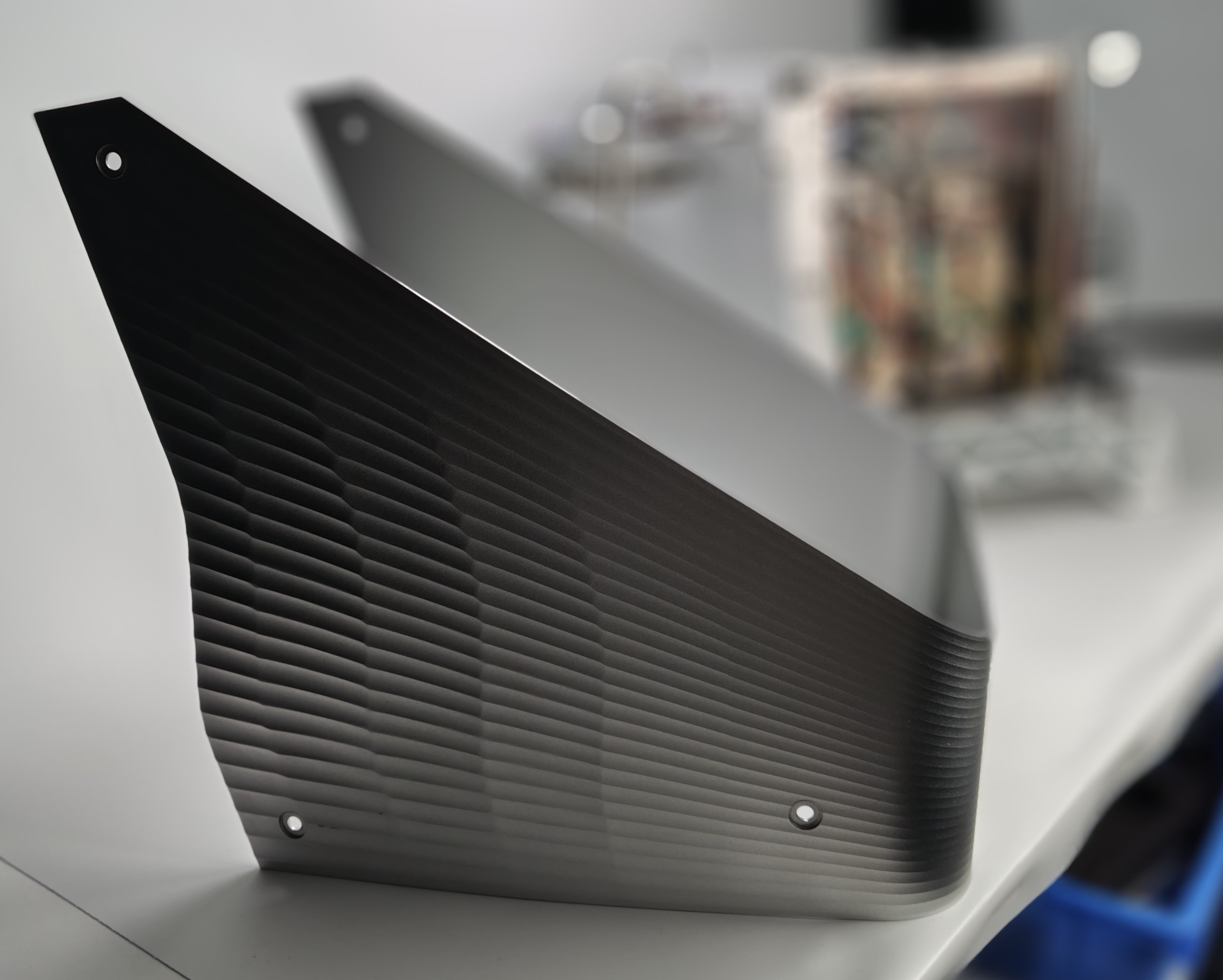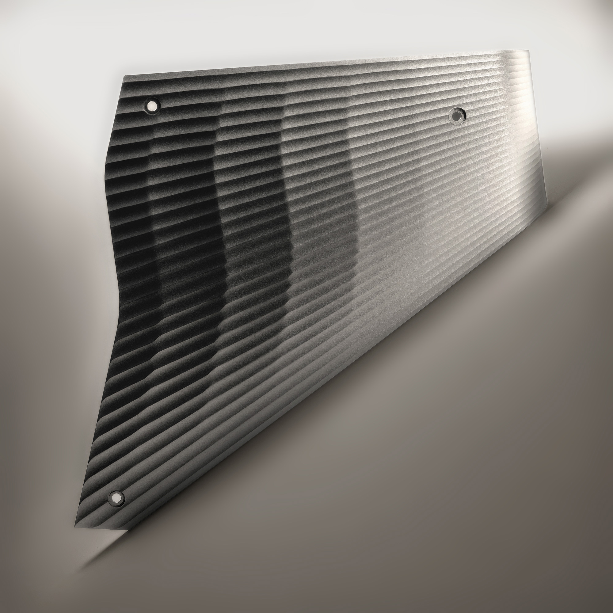 Ultimately, this object is milled in three passes, with different tools and paths used each time. Human post-processing steps, such as sandblasting, painting, drilling and bending, all have to be perfected. We decided to make it in both silver and gold, as each color had its own virtues with this design.