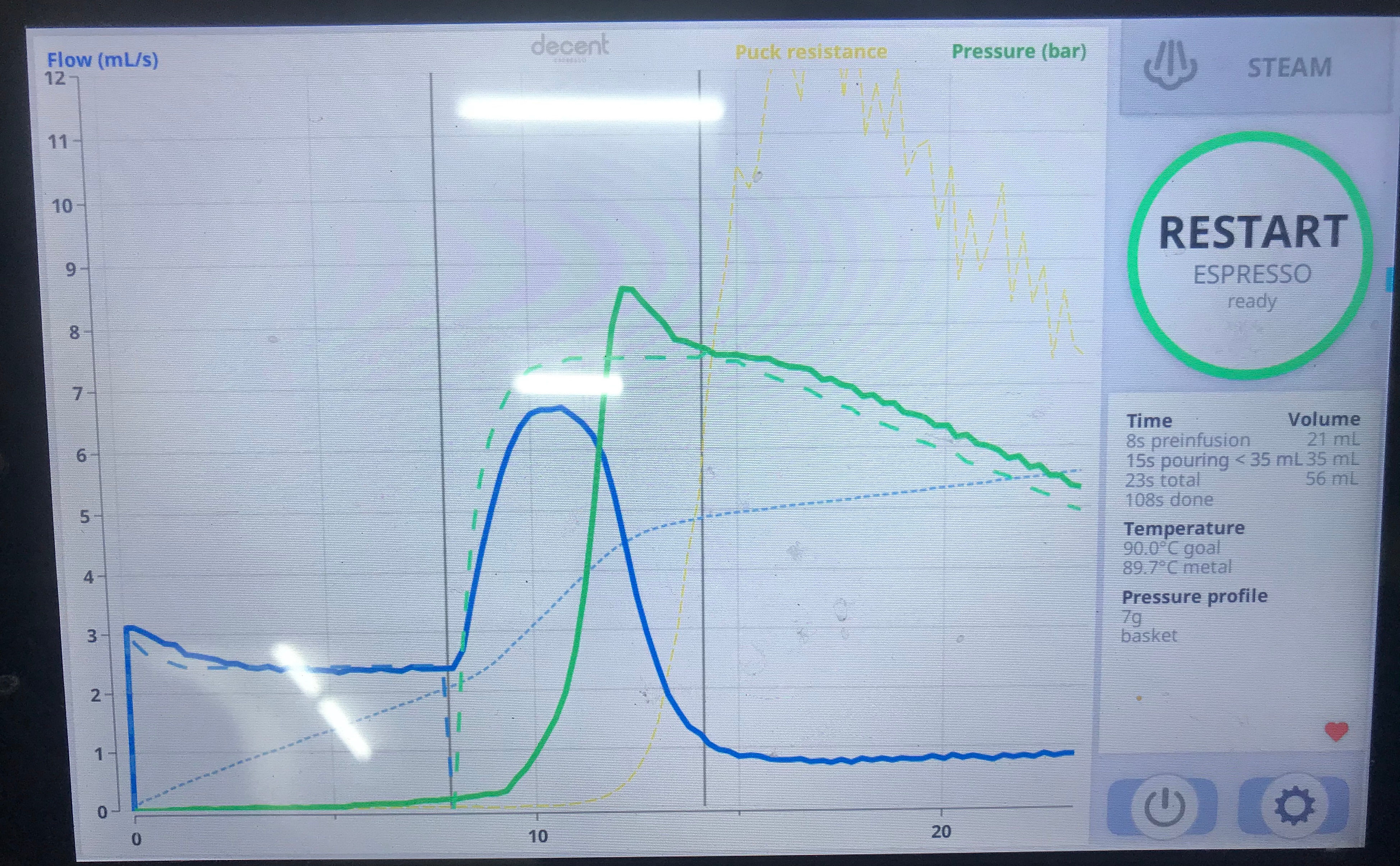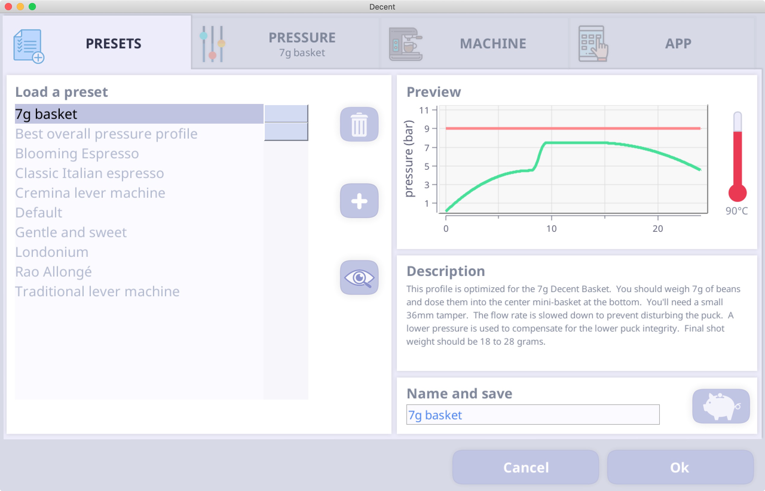 > This profile is optimized for the 7g Decent Basket. You should weigh 7g of beans and dose them into the center mini-basket at the bottom. You'll need a small 36mm tamper. The flow rate is slowed down to prevent disturbing the puck. A lower pressure is used to compensate for the lower puck integrity. Final shot weight should be 18 to 28 grams.