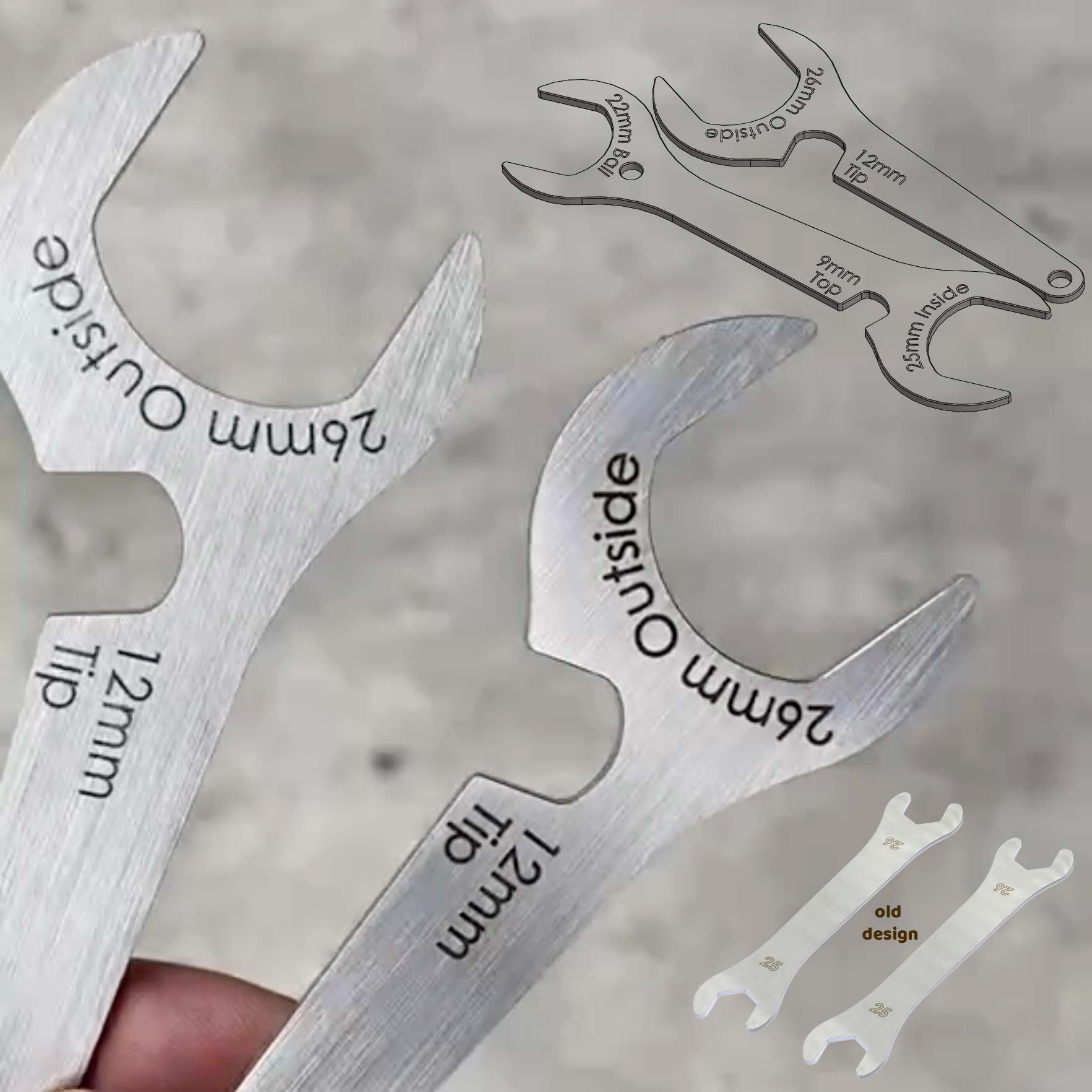 We designed the wrenches ourselves, because our stuff ships air mail, and sending two very heavy, cast-steel wrenches by plane isn't smart. We needed them to be lighter. Our first design (bottom right of the photo) was primitive, and still quite heavy.